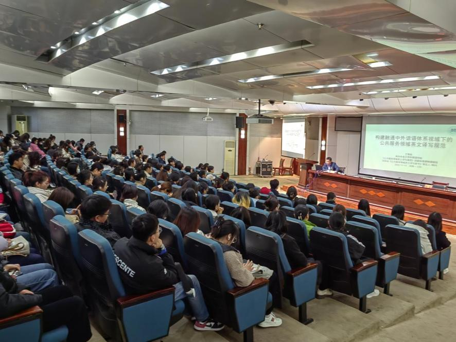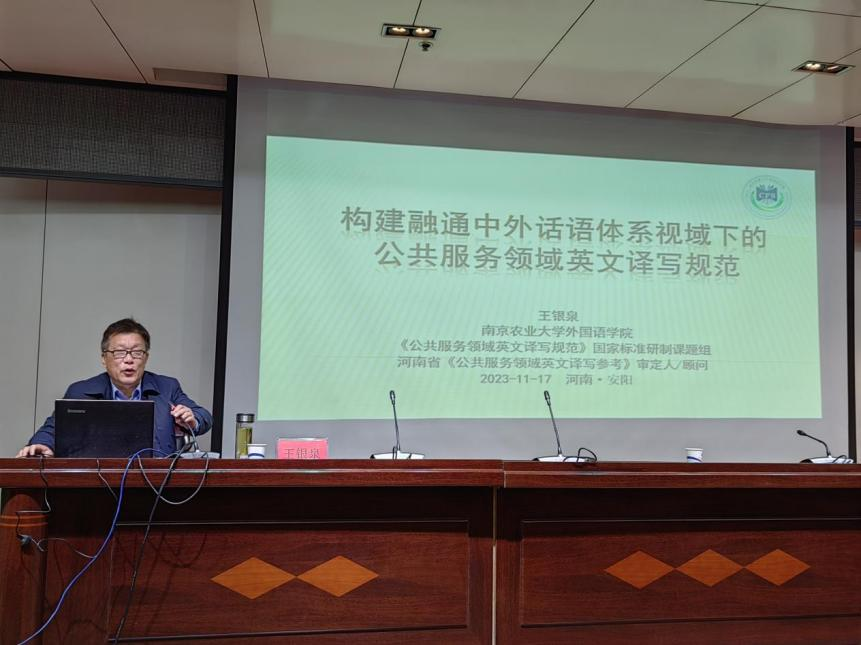 11月17日上午,应公司太阳集团tyc151cc邀请,南京农业大学太阳集团tyc151cc教授王银泉在艺术楼二楼报告厅为太阳集团tyc151cc师生作题为“构建融通中外话语体系视域下的公共服务领域英文译写”的学术报告。太阳集团tyc151cc300余名师生参加报告会。