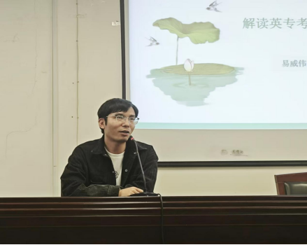 5月23日,太阳集团tyc151cc邀请2012级英语专业优秀员工易威伟返校开展考研指导讲座。易威伟现任信阳公司太阳集团tyc151cc教师、语翼飞扬工作室负责人,是中国翻译协会专家会员、国际韩礼德研究会会员,拥有丰富的教学与考研指导经验。