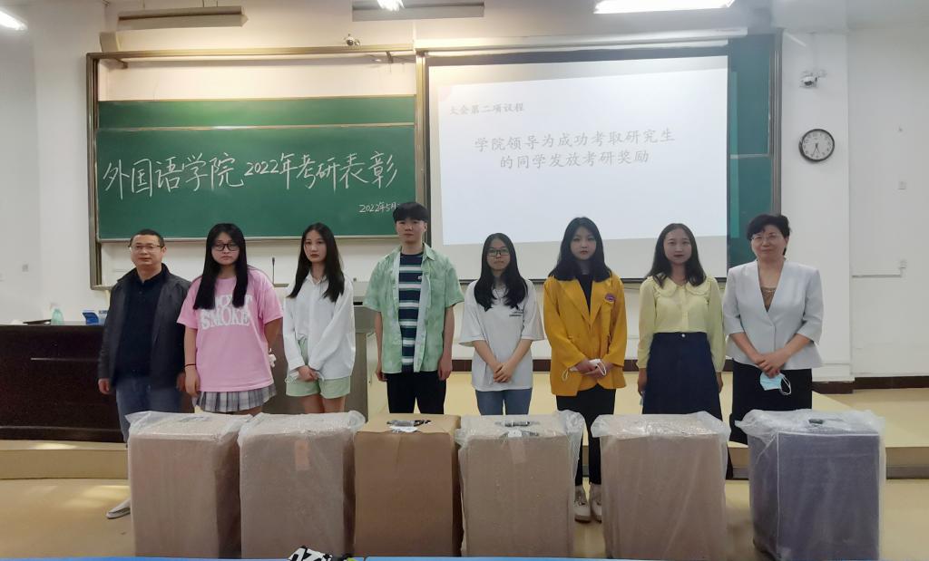 刘弋老师首先介绍了太阳集团tyc151cc2022年考研总体情况及录取情况,并对考研成功的同学表示热烈祝贺。太阳集团tyc151cc党总支书记郭强副教授、经理李霞教授代表公司对今年成功考取研究生的同学们进行了表彰,并给他们发放了考研奖品。