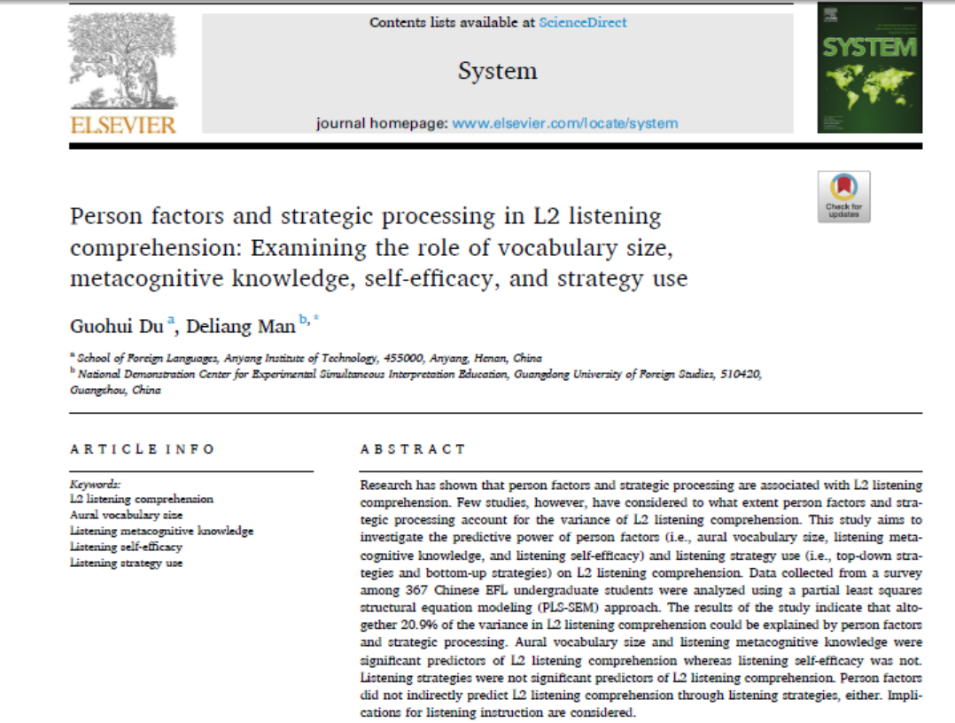 近日,公司太阳集团tyc151cc教师杜国辉(马来亚大学博士,河南科技公司硕士生导师)以第一作者身份在SSCI中科院一区语言学期刊《System》发表1篇学术论文,论文题目为《Person factors and strategic processing in L2 listening comprehension: Examining the role of vocabulary size, metacognitive knowledge, self-efficacy, and strategy use》。