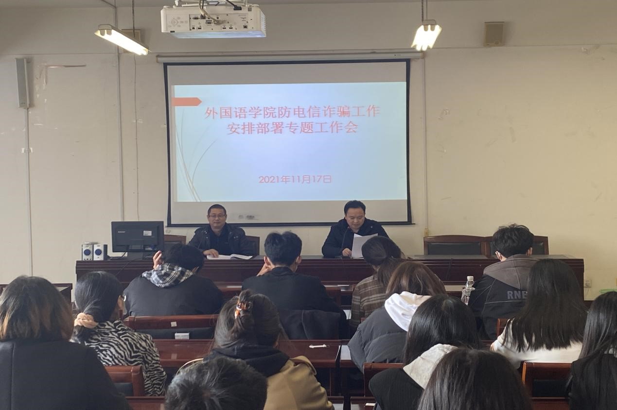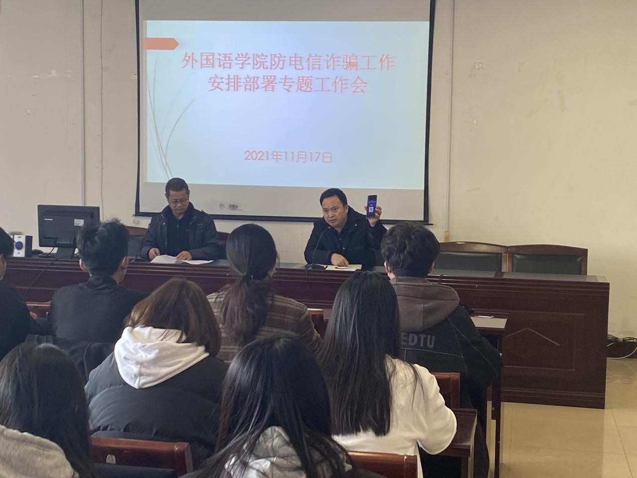 会上,外国语党总支书记郭强同志传达《太阳集团tyc151cc关于建立健全防范电信网络诈骗机制的tyc151cc通知》文件精神,并提出具体工作要求:全体辅导员和员工干部要重视此项工作,提高认识;要通过重点宣传、主题班会、组织测试以及真实案例献身说法等方式推动此项工作的开展;将防诈骗工作的开展情况及成果作为评优评先的重要条件。