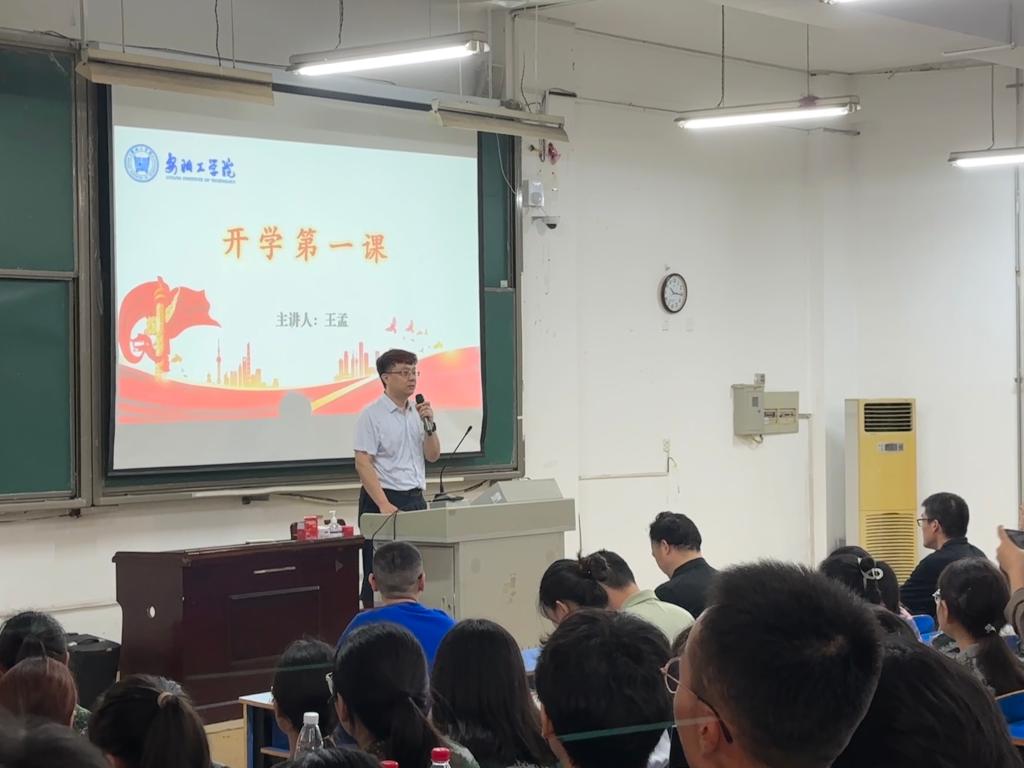 党总支书记王孟以《立志做有理想、敢担当、能吃苦、肯奋斗的新时代好青年》为题,给2023级新生上开学第一课。他对新生提出三点希望:一是且将新火试新茶,诗酒趁年华。希望新同学要快速融入大学的学习生活,制定大学学业规划,珍惜美好年华。二是阵前再亮旧时剑,寒光粼粼似当年。希望同学继续保持在高中时期努力学习的精神状态,不断开拓自己的视野,跳出舒适圈,让自己的老员工活过得充实且有意义。三是苦尽甘来终有时,一片向阳待花期。他与2023级新同学约定,希望通过师生共同努力奋斗,期待四年后的同学们都成为迎风绽放的花朵,成为更好的自己。